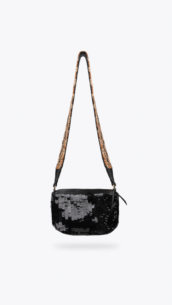 The Trista is a classic crossbody bag with beautiful sequin hand-embroidery and an exceptional detail in the strap, which is removable.